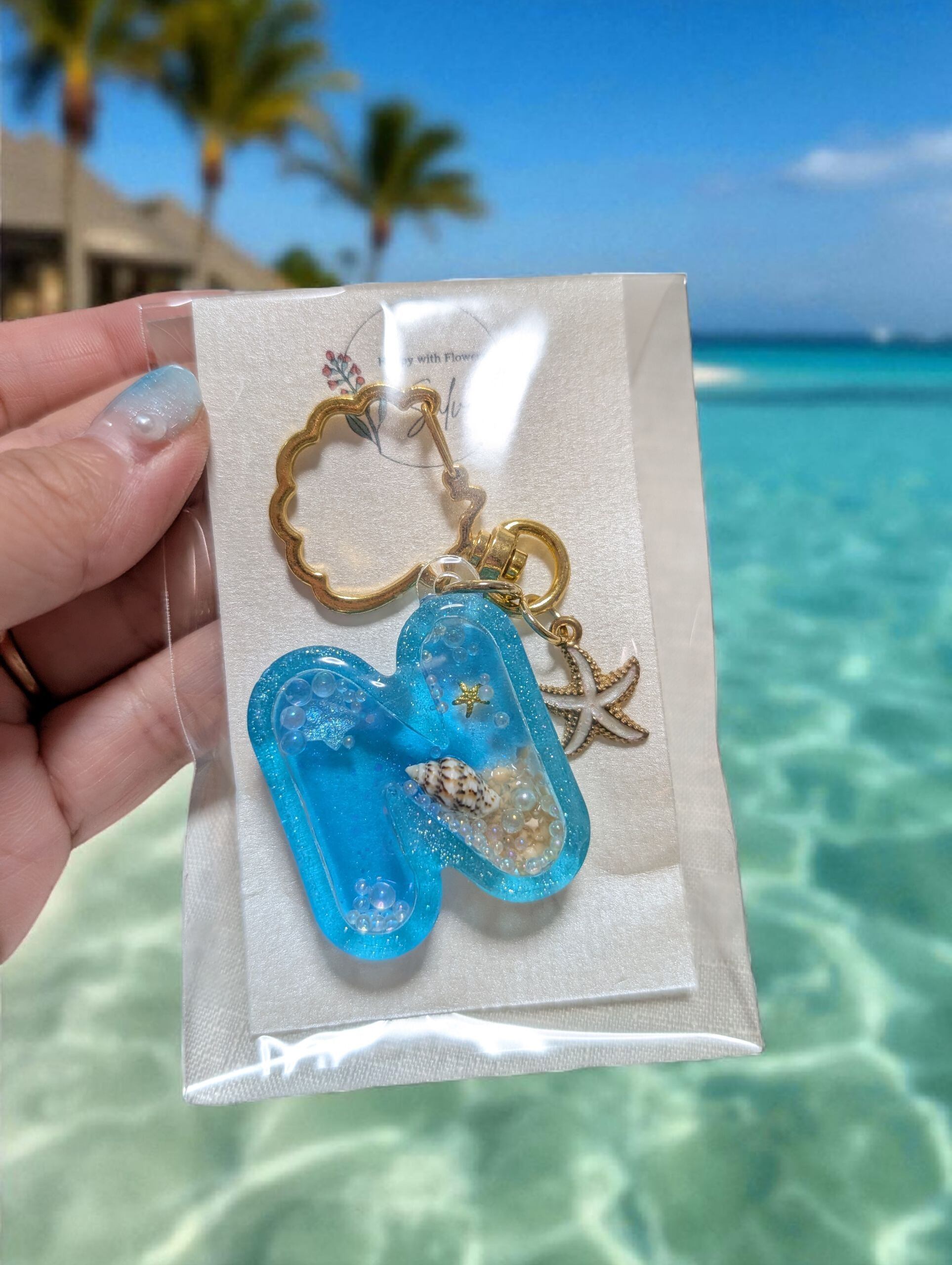 2液性のエポキシレジン液で製作したハーバリウムイニシャルキーホルダーです。