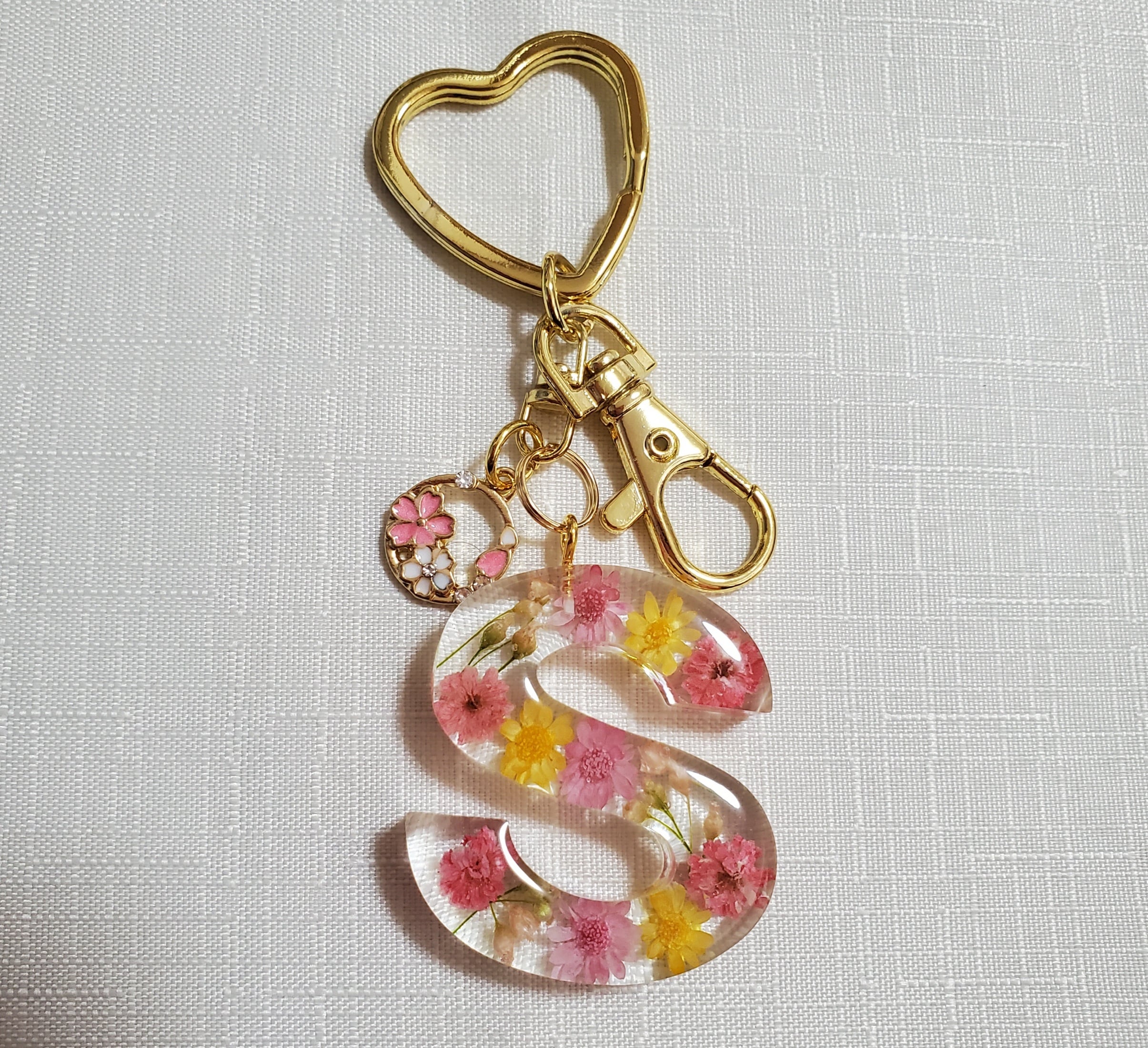 2液性のエポキシレジン液インアリウムで製作したハーバリウムイニシャルキーホルダーです。